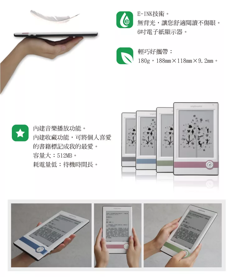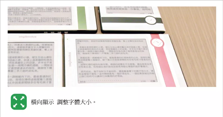 它能夠橫向顯示,且能輕鬆的調整字體大小,並採用E-INK無背光技術,提供使用者有如只一般的閱讀體眼又不傷眼。